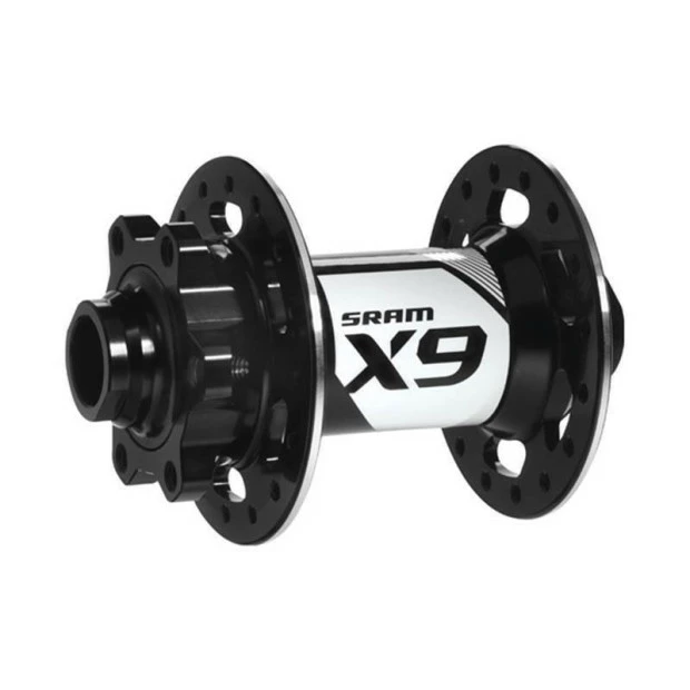Le moyeu avant SRAM X9 pour roue VTT. Il possède 6 trous pour la fixation du disque et se monte avec un axe de 9 mm de diamètre.