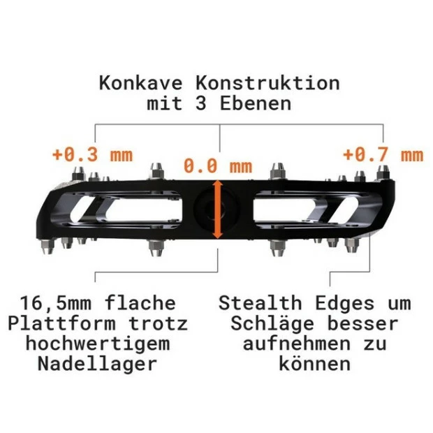 Les pédales Tatze MC-Air sont des pédales plates très puissantes. Elles sont dotées de 14 pitons offrant une excellente adhérence et une conexion optimale avec les chaussures. Les pitons à deux rangées à l’intérieur garantissent une adhérence suffisante, même si les chaussures sont placées un peu plus à l’extérieur. La plate-forme de 107x98x16 mm combine un support sécurisé avec une excellente garde latérale et au sol. L’avant biseauté avec des coins furtifs laisse la pédale glisser sur les obstacles et empêche la saleté de s’accumuler dans la pédale.